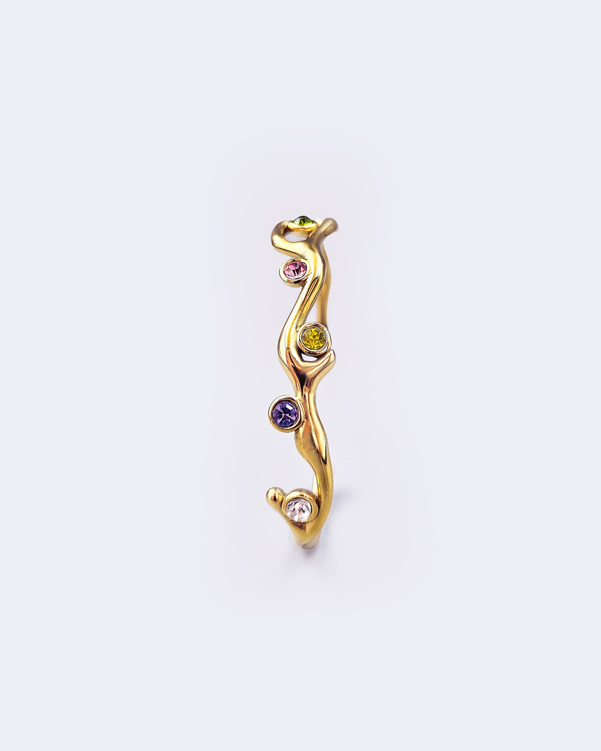 The Reef Ripple Bangle is a sculpted tribute to the beauty of the sea. Its solid, reef-inspired form carries the textures of underwater landscapes, bold and organic in design. Five brilliant gems in candy hues are set along its surface, like treasures revealed by the tide.